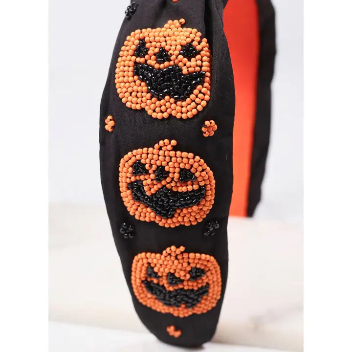 Celebrate spooky season with this black fabric headband accented with beaded pumpkins! It has a top knot accent and a soft microfiber-feel interior as well.