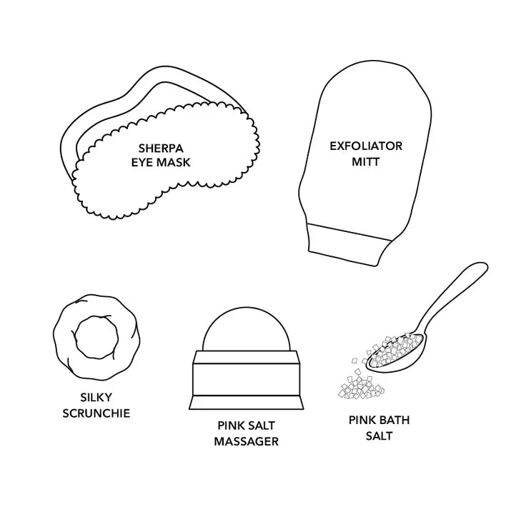 Just say spaaaaah with our new Himalayan Pink Salt Spa Kit, packaged in a blush sherpa dopp bag. Kit contains 5 spa essentials: a pink Himalayan salt massager, an eye mask, a silky scrunchie, lavender bath salts, & an exfoliating mitt. It's the perfect vibe to set you into spring time.