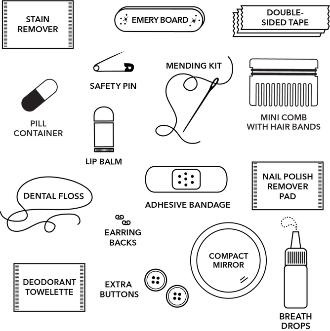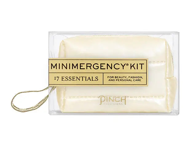 Looking for the ultimate puff piece? Meet the new Puffer Minimergency Kits from Pinch Provisions. This tiny puffer pouch with a matching checkered ribbon zipper pull contains 17 beauty, personal care, and style essentials: stain remover towelette, emery board, double-sided tape, pill container, safety pin, lip balm, mending kit, mini comb, hair bands, dental floss, earring backs, adhesive bandage, nail polish remover pad, deodorant towelette, extra buttons, compact mirror and breath freshener. In other words, everything you need IN A PINCH®!