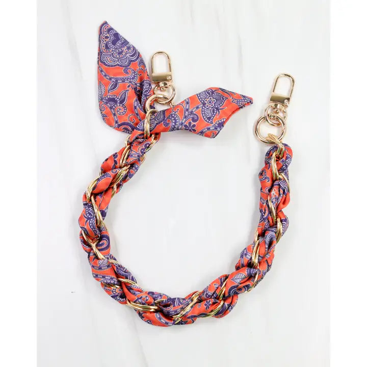 Elevate your accessory game with the Serafina Scarf Purse Chain in a playful Blue and Orange print. Featuring a chic gold link chain intertwined with a stylish printed scarf, this piece effortlessly combines school spirit with sophisticated fashion. Perfect for adding a refined yet spirited touch to your favorite handbag.