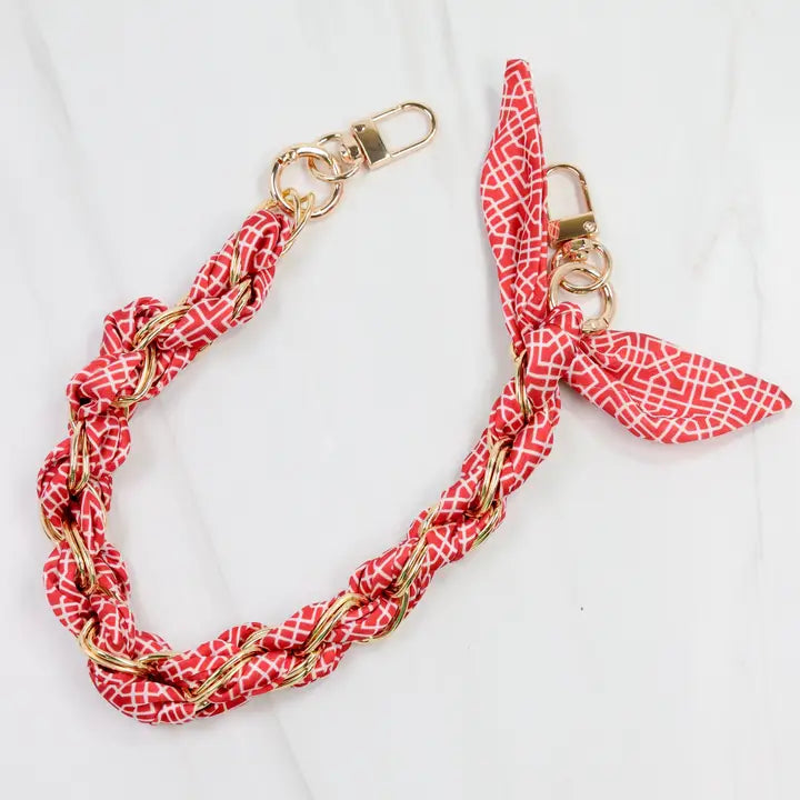 Elevate your accessory game with the Serafina Scarf Purse Chain in a striking red and white geometric print. Featuring a chic gold link chain intertwined with a stylish printed scarf, this piece effortlessly combines school spirit with sophisticated fashion. Perfect for adding a refined yet spirited touch to your favorite handbag.